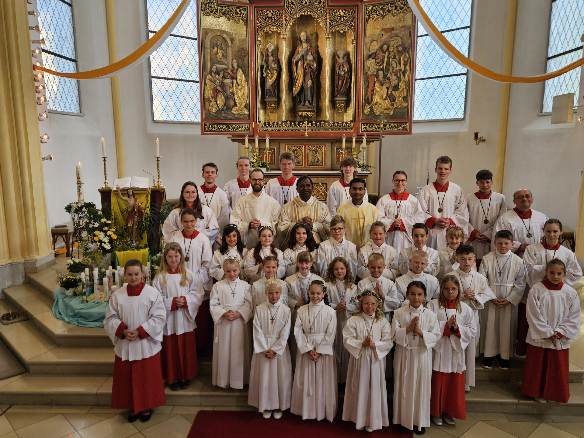 Die Schülerinnen und Schüler gestalteten den Gottesdienst, welchen Pfarrer Dr. Donald und Pfarrvikar Jestin Prathap zelebrierten, aktiv mit. Das diesjährige Erstkommunionthema lautete "Kommt her und esst!“ und spielt dabei auf die Begegnung des Auferstandenen mit den Jüngern am See von Tiberias an, als diese nach erfolglosem Fischfang von Jesus nochmal hinausgeschickt werden und 153 große Fische fangen.