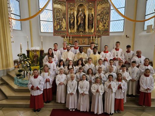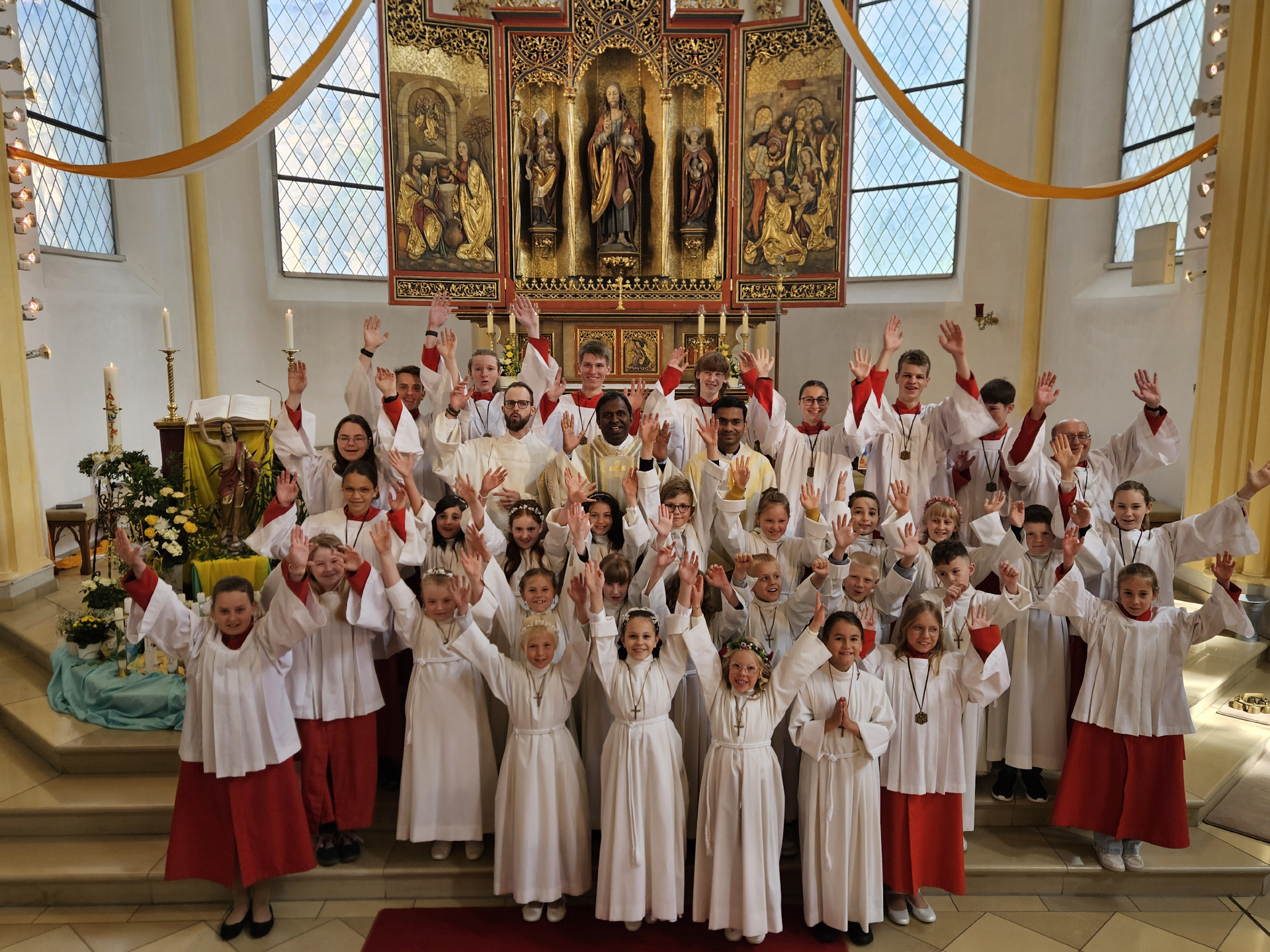 Bei einem Dankgottesdienst am gestrigen Montag trafen sich die Erstkommunionkinder nochmal mit ihren Eltern und Paten in der Kirche. Hier wurden auch die Andachtsgegenstände gesegnet und die Geschenke der Pfarrei an die Erstkommunionkinder überreicht. Pfarrer Dr. Donald dankte allen, die in der Vorbereitung mitgewirkt hatten, besonders den Eltern, die in diesen Zeiten sehr gefordert waren und es auch weiterhin sind.