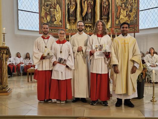 Aus den Händen der Oberministranten Hanna und Elias erhielten die Neuaufgenommenen jeweils ein Aufnahmeurkunde und ein Minishirt, das sie nun auch äußerlich als Mitglieder erkennen lässt. Auch für die Verabschiedeten gab es eine Dankesurkunde sowie ein Geschenk.