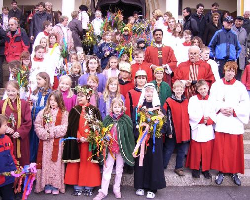 Mit prächtigen Palmbuschen in den Händen versammelte sich die Herz Jesu Gemeinde am 9. April 2006 am Kettelerhaus, um die Palmzweige zu segnen und sich auf die Prozession einzustimmen. Nach dem Evangelium erzählte der Kindergarten Herz Jesu den Einzug in Jerusalem in Liedform. In einer großen Prozession ging es zur Herz Jesu Kirche. Bis auf die letzten Plätze war die Kirche gefüllt und sah die bewegenden Szenen der Passionsbegleiter. Kinder, die am Rande des Kreuzweges standen und den Leidensweg Jesu verfolgten. Mit diesem Gottesdienst beginnt die Heilige Woche. Am Ende des Gottesdienst dankte Pfarrer Lorenz Hägler, den Spielern und dem Kindergarten für ihre Mühe.