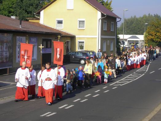 Bei strahlendem Sonnenschein versammelte sich am 28. September 2008 die Herz Jesu Gemeinde am Edeka-Parkplatz zum großen Erntezug durch Rosenberg. Angeführt von den Ministranten und dem Kneipp-Kindergarten machten sich alle Gruppen und Verbände der Pfarrei, begleitet von Blasmusik, auf den Weg durch die Hauptstrasse zur Herz-Jesu Kirche. Empfangen wurde der Zug vom prächtig geschmückten Eingangsportal der Herz Jesu Kirche, das die Pfadfinder und die KJG geschmückt haben.