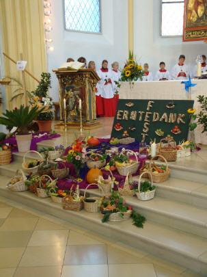 Im festlichen Erntedankgottesdienst drückte Pfarrer Saju Thomas seine Freude über die große Zahl der Gottesdienstbesucher, vor allem der vielen Kinder, aus. In seiner Predigt ging er auf unser Verhältnis zur gesamten Schöpfung ein, mit der wir auf das engste Verbunden sind. Ganz deutlich drückt das der Sonnengesang des Franziskus aus, in dem die Schöpfung als Mutter, Schwester und Bruder bezeichnet wird. Mensch und Schöpfung sind eine Einheit, eine große Familie. Jugendliche stellten mit Symbolen den Sonnengesang dar und gestalteten damit den Erntealtar. Zur Gabenbereitung brachten die Erstkommunionkinder und einige Gemeindemitglieder Körbchen mit Erntegaben, die den Erntealtar ergänzten.
