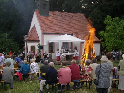 Mit einem ökumenischen Gottesdienst begann der Abend in Stifterslohe. Gläubige aus den beiden Rosenberger Gemeinden, der evangelischen Johannisgemeinde und der katholischen Herz Jesu Pfarrei hatten sich vor der Johanniskapelle in Stifterslohe eingefunden. Viele Kinder und Jugendliche, Konfirmanden und Ministranten, sind zu Fuß nach Stifterslohe gewandert. Pfarrer Dr. Roland Gierth und Pfarrer Saju Thomas begrüßten die zahlreichen Gottesdienstbesucher. Für eine hervorragende musikalische Gestaltung sorgte die Gitarrengruppe aus Poppenricht unter der Leitung von Günter Vogl. In seiner Predigt stellte Pfarrer Dr. Gierth Johannes den Täufer in unsere Zeit, in unsere Gesellschaft und unsere Kirche. Was hat dieser Vorläufer Jesu uns zu sagen? Hören wir seine Apelle an die Gesetzestreue und Gerechtigkeit oder wollen wir sie gerne überhören? So bleibt die Botschaft des Johannes damals ein Apell an unser Gewissen heute.
