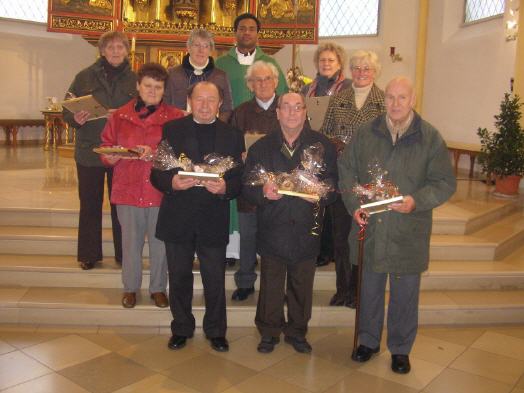Im Rahmen eines festlichen Sonntagsgottesdienstes ehrte Pfarrer Saju Thomas am 16. November 2008 langjährige Mitarbeiter der Pfarrei. Er zeigte sich besonders erfreut, dass so viele sich von ganzem Herzen ehrenamtlich für ihre Pfarrei einsetzen. So konnte er sieben Wohnviertelhelfer für ihren über viele Jahre ausgeübte Sorge um die Caritassammlung und das Kirchgeld ehren: Edeltraud Augsberger, Anita Mölter, Maria Specht, Andreas Hausmann, Theresia Hausmann, Gerlinde Kiener, Maria Schötz, Erika Regner und Margot Dirschedl. Horst Thieme wurde für seine über 20jährige Tätigkeit als Mesner und Josef Schinhammer für über 15 Jahre Mesnerdienst geehrt. Lothar Meier wurde für die Erstellung der Kirchenrechnung gedankt, die er seit 30 Jahren mit großer Sorgfalt erstellt. Alle geehrten bekamen eine Urkunde und ein Geschenk der Pfarrei überreicht. Die Pfarrgemeinde lohnte ihnen ihren Einsatz mit viel Beifall.