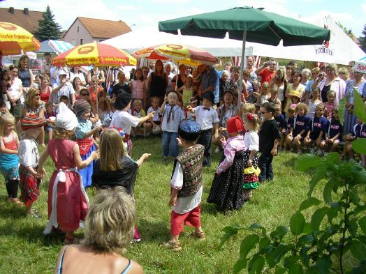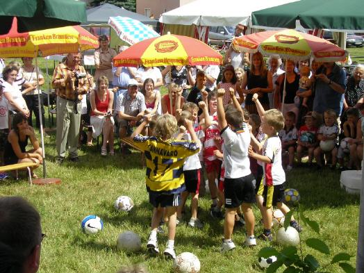 Das bunte Nachmittagsprogramm eröffnete der Kneipp Kindergarten. Auch im Kindergarten dreht sich zur Zeit alles um "König Fußball" und die EM 2008. So liefen die Kinder auf der Wiese am Kettelerhaus auf. In einem Tanz zeigten sie die Trachten der verschiedenen teilnehmenden Länder an der Europameisterschaft. Zu heißen Fußballhymnen gab es eine Trainingseinheit und ein Elfmeterschießen mit jubelnden Fans. Die Leiterin des Kindergartens wünschte allen einen schönen Pfarrfest-Nachmittag und begleitete ihre Kindergarten-Fußballtruppe wieder vom Platz.