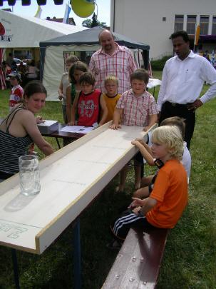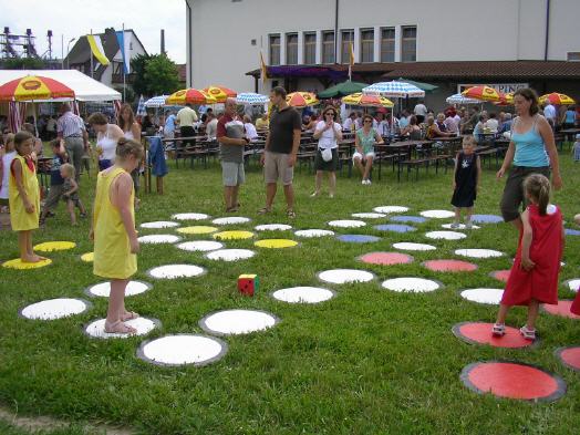 Für ein buntes Programm sorgten die Jugendverbände und Gruppen der Pfarrei: Bei den Pfadfindern gab es beim Maßkrugschieben tolle Preise zu gewinnen, wenn der Krug die Ziellinie erreichte. Die Ministranten sorgten mit dem Menschenkicker und den Rosenburgschützen für spannende Duelle. Die Kolpingfamilie stellte ihr riesiges Mensch-ärgere-dich-nicht Spiel auf, bei dem die Kinder die Spielsteine sein durften und übers Spielfeld hüpften. Bei der Orff-Gruppe gab es ein Riesentrampolin.