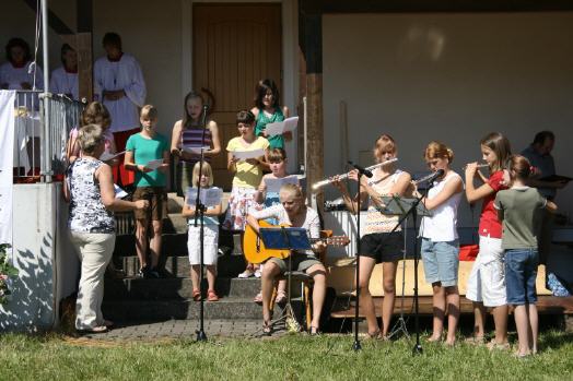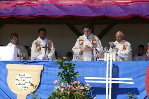 Die Gemeinde Herz-Jesu-Rosenberg lud am 22.6.2008 zum alljährlichen Pfarrfest ein. Den Auftakt des Festtages bildete der Festgottesdienst im Freien auf der Wiese am Kettelerhaus. Als Hauptzelebrant und Prediger konnte Pfarrer Saju Thomas Dekan Walter Hellauer begrüßen und drückte seine Freude über die große Zahl an Gottesdienstbesucher und den so wunderbar gestalteten Freialtar aus. Der Gottesdienst wurde zum Patrozinium der Pfarrei, zum Herz Jesu Fest, gestaltet.