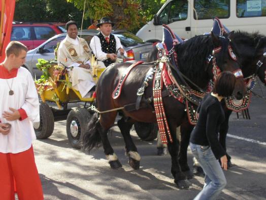 Pfarrer Saju durfte beim Erntezug in der Kutsche von Georg Donhauser Platz nehmen.