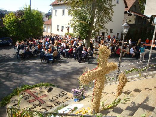 machten sich die Kinder vom Kneipp-Kindergarten, die Erstkommunionkinder und alle Gruppen und Verbände und die Pfarrgemeinde auf den Weg durch die Hauptstrasse zur Herz-Jesu-Kirche. Empfangen wurde der Zug vom prächtig geschmückten Eingangsportal der Herz-Jesu-Kirche, das die Pfadfinder und die KJG geschmückt hatten. Beim Einzug in die Kirche konnte die Gemeinde den prächtigen Erntealtar bewundern, der aus ihren Gaben gestaltet wurde, die sie in den letzten Tagen in der Kirche und im Kindergarten abgegeben hatten.