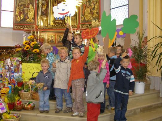 In Lied und Tanz zeigen die Kindergartenkinder ihren Erntedank.