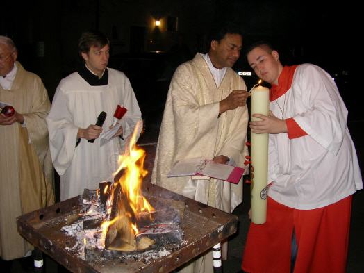 Die neue Osterkerze, die in diesem Jahr von den Ministranten gestaltet wurde, wird gesegnet und entzündet. Mit dem dreimaligen Ruf "Lumen Christi" wird das Osterlicht in der dunklen Kirche begrüßt. Schrittweise wird das Licht weitergegeben und verbreitet sich langsam in der ganzen Kirche. Es folgte das Exsultet, das Loblied auf die Osterkerze. Der Wortgottesdienst mit schloss sich an. Nach den alttestamentlichen Lesungen wurde feierlich das Gloria gesungen, zu dem nach den Tagen der Stille die Orgel und die Glocken wieder erklangen. Die Flügel des Hochaltares wurden geöffnet und der ganze Raum hell erleuchtet. Im Evangelium wurde "Die Botschaft des Engels am leeren Grab" verkündet. Nach Predigt und Allerheiligenlitanei wurde das Taufwasser geweiht und die Gemeinde erneuerte ihr Taufversprechen und wurde mit dem Wasser besprengt. Dann folgte die feierliche Eucharistiefeier. Am Ende des Gottesdienstes verteilten im Licht des Sonnenaufgangs die Seelsorger und Ministranten Osterbrote. Die KJG schenkte allen Gläubigen ein Osterei.