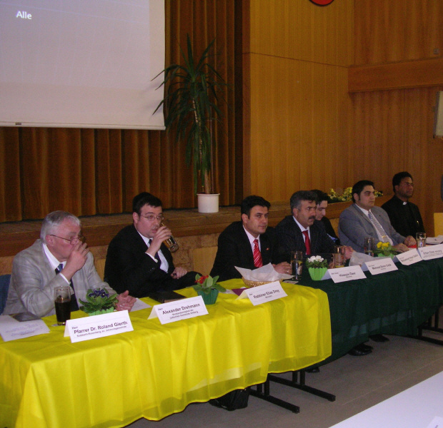 Am Sonntag, 21. März 2010 hatte die Pfarrei auf Initiative des Pfarrgemeinderates eine Veranstaltung zum interreligiösen Dialog organisiert. Pfarrer Saju Thomas begrüßte die zahlreichen Gäste im voll besetzten Kettelerhaus. Sein besonderer Gruß galt neben den Referenten des Abends dem 1. Bürgermeister Gerd Geismann, 2. Bürgermeister Günther Koller, allen Mitbrüdern im priesterlichen Dienst, der Katholischen Erwachsenenbildung, allen Gremien und Verbänden der Pfarrei sowie allen anwesenden Gästen. In seiner Einstimmung auf den Abend ging Pfarrer Saju kurz auf das Ziel des Abends ein, den Dialog unter den Religionen. Dabei geht es nicht um eine Vermischung oder Gleichmachung, sonder ganz im Sinne des zweiten Vatikanischen Konzils um respekt- und verständnisvolles Anerkennen der anderen Religion, ohne die eigenen Wurzeln und den eigenen Glauben zu vergessen. In diesem Sinne wünschte er allen einen bereichernden Abend.