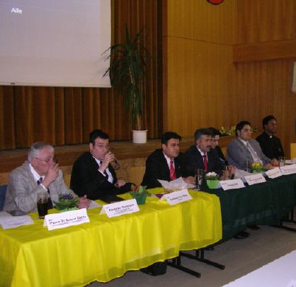 Die Referenten bei der offenen Diskussion von rechts: Dr. Alice Reininger, Pfarrer Saju Thomas, Erhan Cinar, Imam Hüseyin Özer, Imam Mehmet Emin Celik, Imam Muhammet Hayri Sahin, Rabbiner Elias Drey, Pfarrer Dr. Roland Gierth. Nicht im Bild: Dr. Alice Reininger, Richard Beer