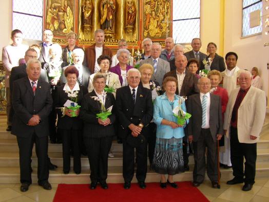 Die Pfarrei Herz Jesu Rosenberg lud auch 2010 wieder alle Jubelpaare, die in diesem Jahr ihr silbernes, goldenes oder diamantenes Ehejubiläum feierten, am 12. September zum Festgottesdienst ein. Pfarrer Saju Thomas begrüßte die Jubelpaare herzlich. In seiner Predigt ging der Geistliche auf den hohen Stellenwert einer christlichen Ehe ein. Die Ehe die aus der Kraft der Liebe durch schöne und schwere Zeiten trägt. Für das Glaubenszeugnis, diesen Jubeltag in der Pfarrkirche zu feiern und Gott für die gemeinsamen Jahre Danke zu sagen, bedankte sich der Pfarrer an dieser Stelle herzlich. Anschließend erneuerten die Jubilare ihr Eheversprechen. Am Ende der Eucharistiefeier überreichte Pfarrer Saju als Erinnerung und Geschenk der Pfarrei an alle Paare eine Orchidee. Sein Dank galt auch allen, die für die musikalische Gestaltung gesorgt haben: Maria Boßle (Orgel), Michael Zollinger (Trompete) und dem Kirchenchor Herz Jesu unter der Leitung von Susanna Müssig. Der festliche Gottesdienst klang am Pfarrhof mit dem gemütlichen Teil aus. Die Kolpingfamilie hatte die gesamte Pfarrgemeinde zum Pfarrcafé eingeladen. Bei strahlendem Sonnenschein nutzten viele Gemeindemitglieder diese Möglichkeit der Begegnung und Geselligkeit.
