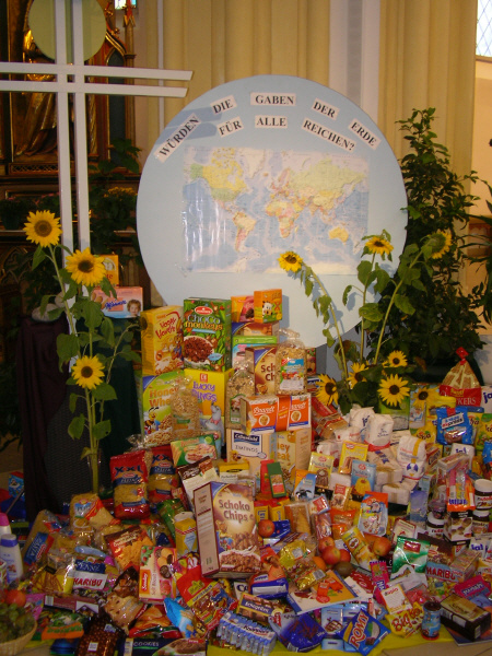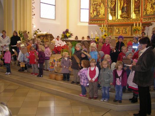 In der Kirche war der Erntealtar aufgebaut, der aus gespendeten Gaben gestaltet wurde, die vorher in der Kirche und im Kindergarten abgegeben wurden und nach dem Fest an die Amberger Tafel weitergegeben werden. Im festlichen Erntedankgottesdienst drückte Pfarrer Saju Thomas seine Freude über die große Zahl der Gottesdienstbesucher, vor allem der vielen Kinder aus. Als Einleitung zur Predigt zeigten zwei Ministrantinnen ein Anspiel, in dem es um den Sinn des Tischgebetes ging.