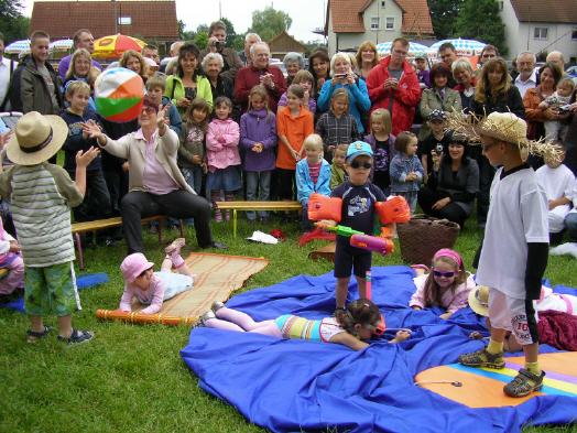 Für ein buntes Programm sorgten die Jugendverbände und Gruppen der Pfarrei. Die KJG verwandelte die Kindergesichter mit bunten Farben in Katzen und Schmetterlinge. Im Zelt der Pfadfindern konnte am offenen Feuer Stockbrot gebacken werden. Spannende Duelle gab es im Menschenkicker und am Schießstand der Rosenburgschützen. An der Wasseroase konnte mit etwas Geschick eine lange Wasserleitung aus Knetmasse gebaut werden. Ein besonderes Highlight war sicher die große Tombola der Ministranten. Über 700 Preise, alle von den Geschäften und Firmen aus der Stadt und dem Landkreis gespendet, wurden verlost und fanden strahlende Gewinner. Der Sachausschuss Soziales bereicherte das Pfarrfest mit einem Verkaufsstand mit Waren aus dem fairen Handel. Hier gab es ein breites Angebot von Kaffee und Tee bis zu schönen Kunstgegenständen. Für zünftige Musik sorgten den ganzen Nachmittag über die Egerländer Musikanten unter der Leitung von Willi Dürschmidt.