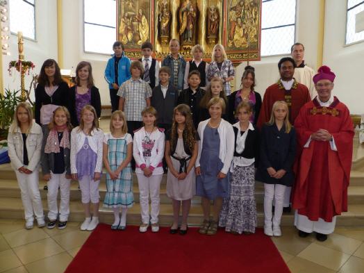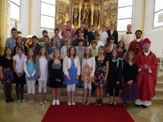 (rechts: Firmspender Domkapitular Dr. Franz Frühmorgen, 2 Reihe rechts Pfarrer Saju Thomas, 3. Reihe rechts Religionslehrer Michael Koller