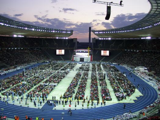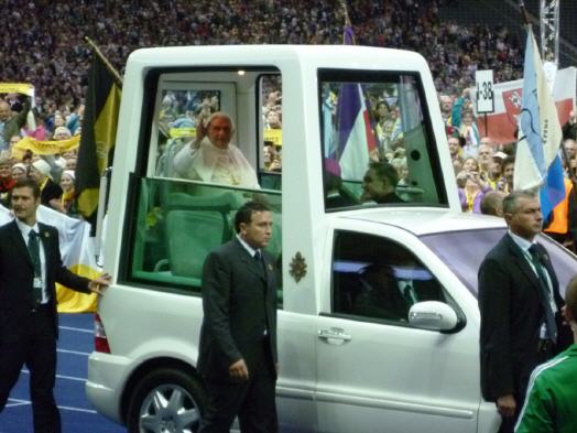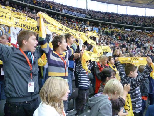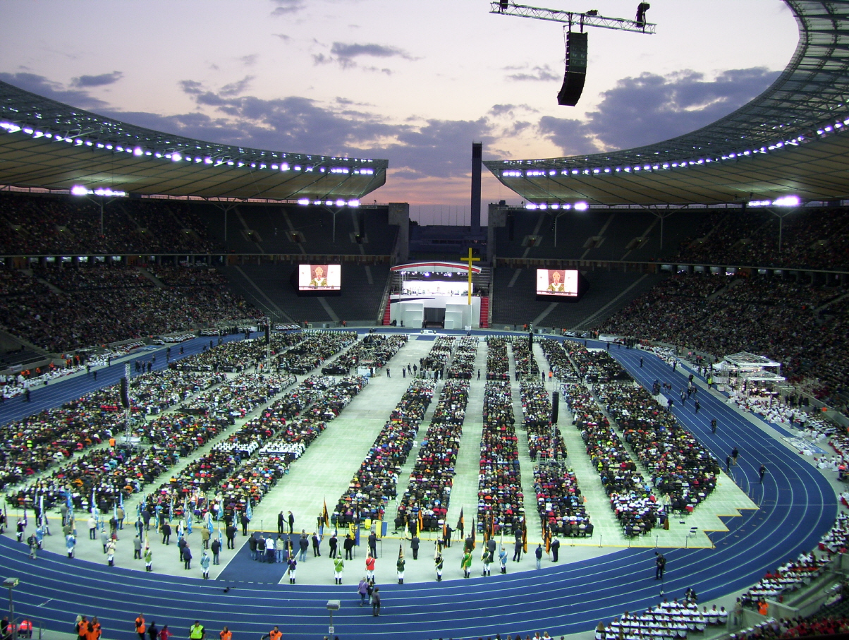 Nachdem die Gruppe am frühen Nachmittag in der Unterkunft, einer Grundschule im Berliner Vorort Zehlendorf ankam, ging es sofort mit der S-Bahn weiter Richtung Olympiastadion. Die tolle Stimmung im Stadion und die besondere Atmosphäre zog alle in ihren Bann. Erstes Highlight war die Ankunft und Ehrenrunde von Papst Benedikt im Stadion. Dank der tollen Plätze in den ersten Reihen, waren alle nah dran. Alle 6000 Regensburger Pilger machten sich lautstark bemerkbar und durch die einheitlichen Pilgertücher auch gut sichtbar.
