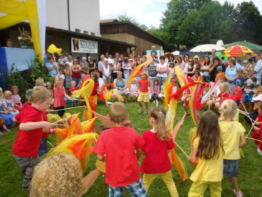 Nach der Begrüßung durch Pfarrer Saju Thomas eröffnete der Kneipp Kindergarten das bunte Nachmittagsprogramm. Die Kinder zeigten mit Gesang und Tanz die Freude an der wunderbaren Schöpfung Gottes, die den Kindern so viel Freude macht. Vom Spass im Wasser bis hin zum Pflanzen eines Baumes oder den Spass am Lagerfeuer zeigten sie die vielen Möglichkeiten auf. Anschließend wünschte die 2. Sprecherin des Pfarrgemeinderates, Christine Heller, allen Gästen des Pfarrfestes gute Unterhaltung bei Spiel und Spaß, Musik und Brotzeit und konnte noch zahlreiche Ehrengäste begrüßen: Bürgermeister Gerd Geismann, 2. Bürgrmeister Günter Koller, 3. Bürgermeister Hans Jürgen Reitzenstein und den Nachbarpfarrer von der evangelischen Johannisgemeinde Dr. Roland Gierth. Für ein buntes Kinder- und Jugendprogramm sorgten die Jugendverbände und Gruppen der Pfarrei. Die KJG verwandelte die Kindergesichter mit bunten Farben in Katzen und Schmetterlinge. Eine besondere Herausforderung galt es bei den Pfadfindern zu bestehen. Gesichert durch Klettergurte an einem Kran konnten Bierkästen gestapelt und erklommen werden. Die Geschicktesten schafften über 15 Kästen und erreichten schwindelerregende Höhen. Spannende Duelle gab es bei den Ministranten im Menschenkicker und am Schießstand der Rosenburgschützen. Eine willkommene Abkühlung gab es an der dichtumlagerten Wasseroase, wo mit etwas Geschick eine lange Wasserleitung aus Knetmasse entstand. Ein besonderes Highlight war der große Kletterfelsen, der vom Familiengottesdienstkreis betreut wurde. Ein riesiges Luftkissen in dessen Mitte ein vier Metter hoher Felsen ragte. So konnten die kleinen Gäste nach herzenslust Hüpfen und die älteren Schüler an Klettergriffen den Berg bezwungen. Der Sachausschuss Soziales bereicherte das Pfarrfest durch einen Verkaufsstand mit Waren aus dem fairen Handel. Hier gab es ein breites Angebot von Kaffee und Tee bis zu schönen Kunstgegenständen. Für zünftige Musik sorgten den ganzen Nachmittag über die Egerländer Musikanten unter der Leitung von Willi Dürrschmidt. Auch für Speis und Trank war bestens gesorgt, der Frauenbund bot Kaffee und Kuchen an. Die KAB versorgte die Gäste mit Bratwürsten. Die Kolpingfamilie übernahm den Ausschank und den Käsestand. Den Weinstand übernahm das Pfarrbüro. Auch die erstmals vom Pfarrgemeinderat angebotenen Cocktails kamen gut an. Der Pfarrgemeinderat übernahm unter der Regie des Ausschuss Feste und Feiern, die Festleitung und sorgte zusammen mit der Kirchenverwaltung und vielen ehrenamtlichen Helfern für den reibungslosen Ablauf und die Bewirtung der Gäste.