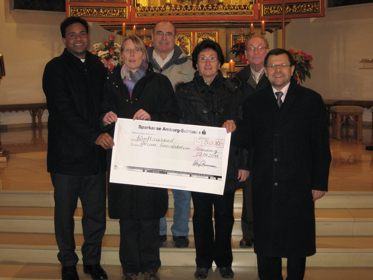 Der Elisabethenverein Herz Jesu Rosenberg übergab im Januar 2011 eine großzügige Spende an die ökumische Sozialstation Sulzbach-Rosenberg. Die Leiterin der ökumenischen Sozialstation, Brigitte Riederer, freute sich über eine Spende in Höhe von 5000 Euro, die der Elisabethenverein Herz Jesu Rosenberg übergab. Pfarrer Saju Thomas als 1. Vorsitzender des Elisabethenvereins Herz Jesu Rosenberg bedankte sich für die wertvolle Arbeit der ökumenischen Sozialstation und unterstützt gerne diese gute Einrichtung. Auch der Geschäftsführer des Caritasverbandes Amberg-Sulzbach, Günter Koller, dankte dem Verein für die großzügige Spende.