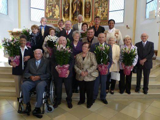 Am 16.9.2012 waren alle Jubelpaare, die dieses Jahr ihr silbernes, goldenes oder diamantenes Ehejubiläum feiern, zum Festgottesdienst eingeladen. Pfarrer Saju Thomas zog mit den Jubelpaaren in die Kirche ein und begrüßte alle herzlich. In seiner Predigt ging der Geistliche auf den Kern einer christlichen Ehe ein. So sei eine gelingende Ehe, wie sie die Jubelpaare über 25, 50 und 60 Jahre führen nur möglich, wenn sich die Ehepartner voll und ganz Vertrauen und jede gegenseitige Kritik positive formulieren. So eine positive Bestärkung lässt die Beziehung wachsen und reifen, so der Geistliche. Für das Glaubenszeugnis, diesen Jubeltag in der Pfarrkirche zu feiern und Gott für die gemeinsamen Jahre Danke zu sagen, bedankte sich der Pfarrer am Ende seiner Predigt herzlich. Anschließend traten die Jubilare vor den Altar und erneuerten ihr Eheversprechen. Am Ende der Eucharistiefeier überreichte Pfarrer Saju als Erinnerung und Geschenk der Pfarrei an alle Paare einen Blumenstock. Sein Dank galt auch dem Kirchenchor unter der Leitung von Susanna Müssig-Wilczek, für die festliche musikalische Gestaltung. Der Festtag klang am Pfarrhof mit dem gemütlichen Teil aus. Die Jugendgruppe Tawa Pano hat zum Pfarrcafé eingeladen. Bei strahlendem Sonnenschein nutzten viele Gemeindemitglieder diese Möglichkeit der Begegnung und frohen Geselligkeit.