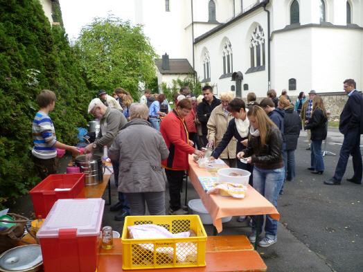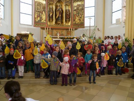 Im festlichen Erntedankgottesdienst drückte Pfarrer Saju Thomas seine Freude über die große Zahl der Gottesdienstbesucher, vor allem der vielen Kinder aus. In seinem Predigtgespräch mit den Kindern machte Pfarrer Saju deutlich, dass alle Menschen in einer Welt leben, die für alle Menschen reichlich Erntegaben spendet, die bei gerechter Verteilung auch für alle Menschen reichen. Als Ausdruck der Dankbarkeit brachten die Erstkommunionkinder zur Gabenbereitung Körbchen mit Erntegaben, die den Erntealtar ergänzten und ebenfalls der Tafel zugute kommen. Die Ministranten brachten symbolische Gaben, die für die Ernährung lebensnotwendig sind. Abschließend Brot und Wein für die Heilige Messe. Nach der Eucharistiefeier sangen die Kinder vom Kneipp-Kindergarten ein Erntelied und zeigten dazu ihre gebastelten Erntegaben. Am Ende des Gottesdienstes bedankte sich Pfarrer Saju Thomas bei allen, die sich um die Vorbereitung und Durchführung des Erntedankfestes gekümmert haben, besonders für die Musik bei Stephan Horst und seiner Kinderband. Bei Eintopf und Weißwürsten klang das Erntedankfest in der herrlichen Mittagssonne vor der Pfarrkirche in gemütlicher Runde aus.