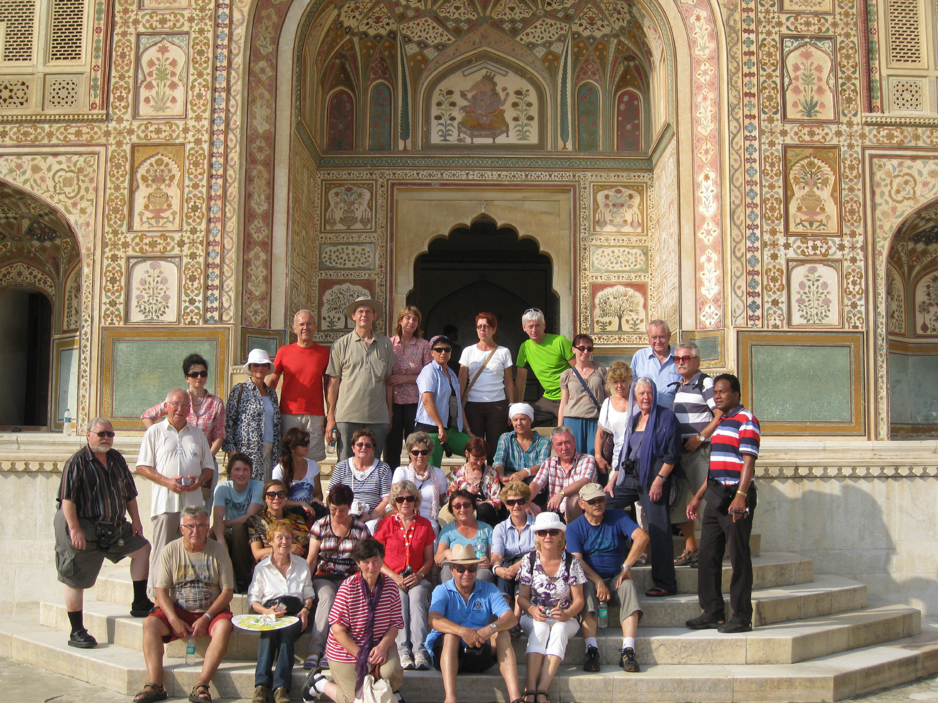 Am nächsten Morgen erwartet uns ein besonderes Erlebnis: Unser Bus kann nur bis zu einem Parkplatz fahren unterhalb des Forts Amber. Den Aufstieg erleben wir jeweils zu zweit auf einem Elefantenrücken. Bequem war´s nicht, ein rechtes „Hin- und Hergeschaukle“, denn unser Dickhäuter muss einen unebenen, steilen Weg gehen. Ohne Festhalten wären wir ganz sicher mehrmals abgestürzt. Einige kommen „bleichgesichtig“ an. Obwohl bereits bezahlt, erinnert uns der Elefantenführer nachdrücklich an ein Bakschisch, das wir ihm aber gerne geben. Das Fort wirkt gewaltig mit seinen riesigen Wällen. Wir bestaunen weite Innenhöfe, Wasserbecken, spezielle Wintergebäude mit Lüftungsleitungen und insbesondere Spiegelintarsien. Zu bestaunen ist auch ein Rollstuhl für eine Mogulin. Sie war so sehr mit Schmuck behängt, dass sie selbst nicht mehr zu gehen vermochte. Wieder draußen bedrängen uns die „Geier“. So nennt unser Reiseführer die Andenkenverkäufer, die hier so lästig sind wie noch nie.