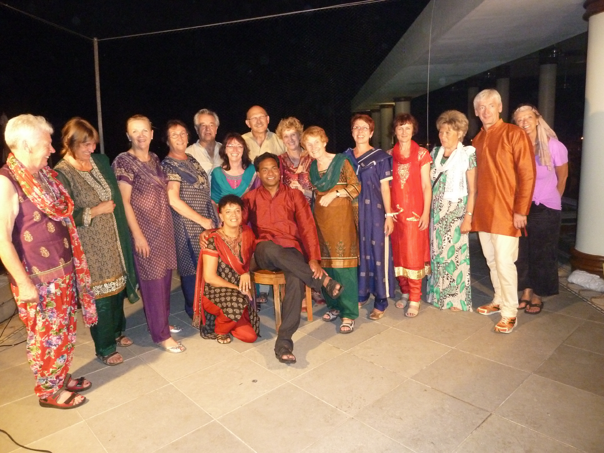 Ab München starten wir mit Airbus A 380 der Fluggesellschaft „The Emirates Airline“. Dieses größte Passagierflugzeug weltweit hat Platz für 800 Reisende verteilt auf 2 Stockwerke. Jeder Passagier hat vor sich einen Monitor, welcher die Flugbahn geografisch aufzeichnet. Nach Zwischenaufenthalt in Dubai bringt uns ein kleinerer Airbus zum Flughafen in New Delhi. Als wir den klimatisierten Flughafen verlassen, schlägt uns eine schweißtreibende Hitzewelle von 38° mit extrem hoher Luftfeuchtigkeit entgegen. Mit einem Blumengebinde und einem roten Tupfer auf die Stirn heißt man uns willkommen. Nach einem üppigen Abend-Buffet und weil wir 27 Stunden kaum geschlafen haben, fällt jeder todmüde ins Bett.