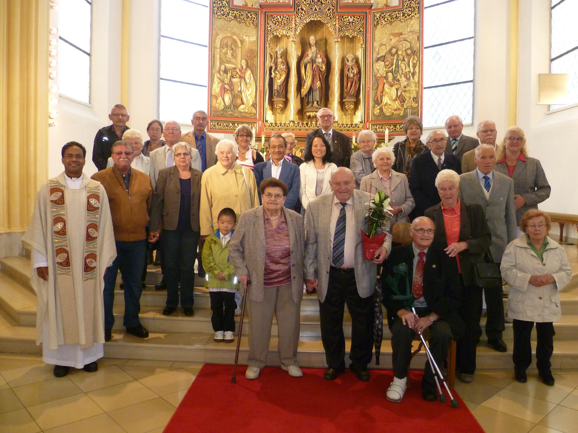 Die Pfarrei Herz Jesu Rosenberg lud am Sonntag, 21.9.2014 alle Jubelpaare, die dieses Jahr ihre silberne, rubin, goldene, diamantene und eiserne Hochzeit feierten zum Festgottesdienst ein. Pfarrer Saju Thomas zog mit den Jubelpaaren in die festlich geschmückte Herz Jesu Kirche ein und begrüßte alle herzlich. Besonders drückte er seine Freude darüber aus, dass 13 Jubelpaare der Einladung zum Festgottesdienst gefolgt sind. Die zahlreiche Teilnahme am Jubiläumsgottesdienst, so Pfarrer Saju zeigt deutlich den Stellenwert von Ehe und Familie für Kirche und Gesellschaft auf. So sind die Jubelpaare, die über 25, 40, 50, 60, 65 und mehr Ehejahre feiern ein Vorbild für die jungen Menschen. An ihnen wird deutlich, wie ein Leben in Liebe und Vertrauen in guten und schweren Zeiten gelingen kann. Für das Glaubenszeugnis, diesen Jubeltag in der Pfarrkirche zu feiern und Gott für die gemeinsamen Jahre Danke zu sagen, bedankte sich der Pfarrer im Rahmen seiner Predigt herzlich. Anschließend erneuerten die Jubelpaare ihr Eheversprechen und feierten gemeinsam mit der ganzen Pfarrgemeinde Eucharistie. Am Ende des Gottesdienstes überreichte Pfarrer Saju als Erinnerung und Geschenk der Pfarrei an alle Paare einen Blumenstock sowie eine Urkunde. Der Festtag klang am Pfarrhof mit dem gemütlichen Teil aus. Der Pfarrgemeinderat und die Kirchenverwaltung haben zum Pfarrcafé mit Frühschoppen eingeladen.