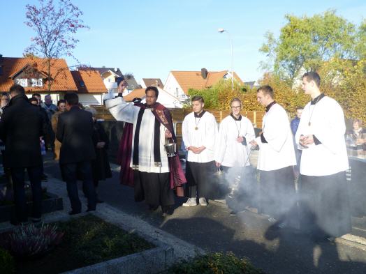 Pfarrei Herz Jesu Rosenberg gedenkt der Verstorbenen. In der voll besetzten Herz Jesu Kirche begrüßte Pfarrer Saju Thomas die versammelte Gemeinde, die jetzt in liebender Erinnerung an alle verstorbenen Menschen denkt. Neben dem Marienaltar war die Totenstele mit allen Sterbebildern und der Sterbekerze aufgestellt. Im Totengedenken wurde aller 48 Verstorbener seit 01.11. des vergangenen Jahres gedacht und ihre Namen verlesen. In allen Texten spiegelte sich der Gedanke an die Auferstehung wieder, die das Fundament der christlichen Hoffnung darstellt. Für die passende musikalische Gestaltung sorgte der Kirchenchor Herz Jesu unter der Leitung von Susanna Müssig-Wilczek. Nach der Andacht zog die versammelte Gemeinde zum Friedhof, um dort die Gräber der verstorbenen Angehörigen zu besuchen. Nach den Gebeten für die Verstorbenen ging Pfarrer Saju Thomas durch die Gräberreihen und segnete mit Weihwasser und Weihrauch die Gräber der verstorbenen Angehörigen.
