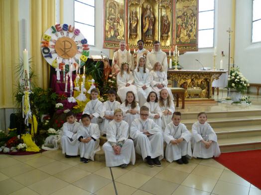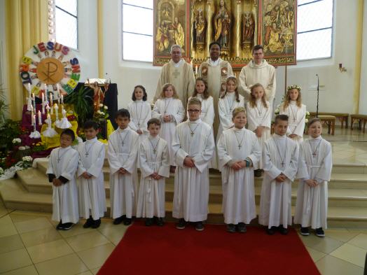 Abschließend dankte er den Kommunionkindern und ihren Eltern für ihr Glaubenszeugnis und gratulierte herzlich zu diesem großen Festtag. Zum Vater Unser durften sich alle Kinder um den Altar versammeln und brachten so ihre Verbundenheit untereinander im Gebet zum Ausdruck. Feierlichster Moment war für die Kommunionkinder der Empfang der ersten Heiligen Kommunion unter beiderlei Gestalt, in Leib und Blut Christi. Hier durften sie zum ersten mal die Mahlgemeinschaft mit Jesus Christus erfahren und ihn als Brot des Lebens erkennen. Am Ende des Gottesdienstes bedankten sich die Kinder bei allen Mitfeiernden, den Eltern, Freunden und Verwandten. Pfarrer Saju dankte allen, die zum guten Gelingen der Erstkommunionfeier beigetragen haben, durch die Vorbereitung des Gottesdienstes und der Kirche, sowie den Tischmüttern für die Vorbereitung der Kinder. Vor allem für die musikalische Gestaltung dem Spontanchor und der Band unter der Leitung von Susanna Müssig-Wilczek. Sein Dank galt auch den Anwohnern für den Schmuck des Prozessionsweges zur Kirche und der Feuerwehr für die Absicherung. Mit dem Schlußsegen, dem Te Deum und dem großen Auszug endete der festliche Erstkommuniongottesdienst.