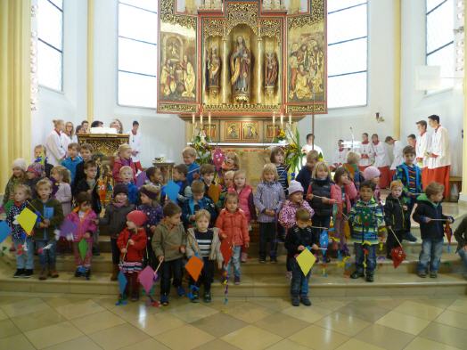 Im Familiengottesdienst drückte Pfarrer Saju Thomas seine Freude über die große Zahl der Gottesdienstbesucher, vor allem der vielen Kinder aus. Die Kinder packten aus einem großen Geschenk viele symbolische Gegenstände aus, für die alle an Erntedank Gott danke sagen wollen. Zur Gabenbereitung brachten die Erstkommunionkinder Körbchen mit Erntegaben, die den Erntealtar ergänzten und ebenfalls der Tafel zugute kommen sollen. Gemeinsam wurde anschließend Eucharistie gefeiert.. Nach der Kommunionspendung sangen die Kinder vom Kneipp-Kindergarten auf den Altarstufen ein Erntelied und zeigten dazu ihre gebastelten Drachen. Am Ende des Gottesdienstes bedankte sich Pfarrer Saju Thomas bei allen, die sich um die Vorbereitung und Durchführung des Erntedankfestes gekümmert haben. Für den Erntezug bei den Verbänden mit ihren Bannern und Erntewägen, der Blasmusik und der Freiwilligen Feuerwehr für die Absicherung des Weges. Für den Liedbeitrag des Kneipp Kindergartens. Regina Brandhuber für die Musik und dem Familiengottesdienstteam für die Gottesdienstvorbereitung. Dem Sachausschuss Liturgie, dem Pfarrgemeinderat und der Kirchenverwaltung für die Vorbereitungen in der Kirche und am Kirchplatz. Der Kolpingfamilie und den Pfadfindern für die Mittagsverpflegung. Anschließend war die ganze Pfarrgemeinde auf den Kirchplatz eingeladen um bei Eintopf und Weißwürsten das Erntedankfest in gemütlicher Runde ausklingen zu lassen.