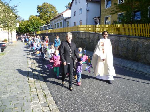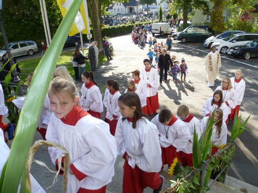 Am Sonntag, 27. September 2015, versammelte sich die Herz-Jesu Gemeinde beim ehemaligen Edeka-Parkplatz zum großen Erntezug durch Rosenberg. Angeführt von den Ministranten, den Kindergartenkindern und den Kommunionkindern zusammen mit den Fahnenabordnungen der kirchlichen Gruppen und Verbände und der gesamten Pfarrgemeinde begleitet von zünftiger Blasmusik auf den Weg durch Rosenberg bis zur Herz Jesu Kirche. Auch zwei Erntewägen wurden mitgeführt, von der Kolpingfamilie und vom Pfarrgemeinderat. Empfangen wurde der Zug vom prächtig geschmückten Eingangsportal der Herz Jesu Kirche. In der Kirche waren zwei Erntealtäre aufgebaut, die aus gespendeten Gaben gestaltet wurden, die vorher in der Kirche und im Kindergarten abgegeben wurden und nach dem Fest an die Amberger Tafel weitergegeben werden.