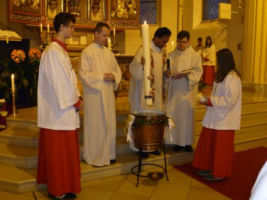 und Allerheiligenlitanei wurde das Taufwasser geweiht, dazu wurde die Osterkerze drei mal in das Taufwasser gesenkt. Anschließend erneuerte die Gemeinde ihr Taufversprechen und wurde mit dem Wasser besprengt. Dann folgte die festliche Eucharistiefeier. Am Ende des Gottesdienstes verteilten im Licht der Morgensonne die Seelsorger und Ministranten die Osterbrote und Ostereier als Geschenk an die Gemeinde.