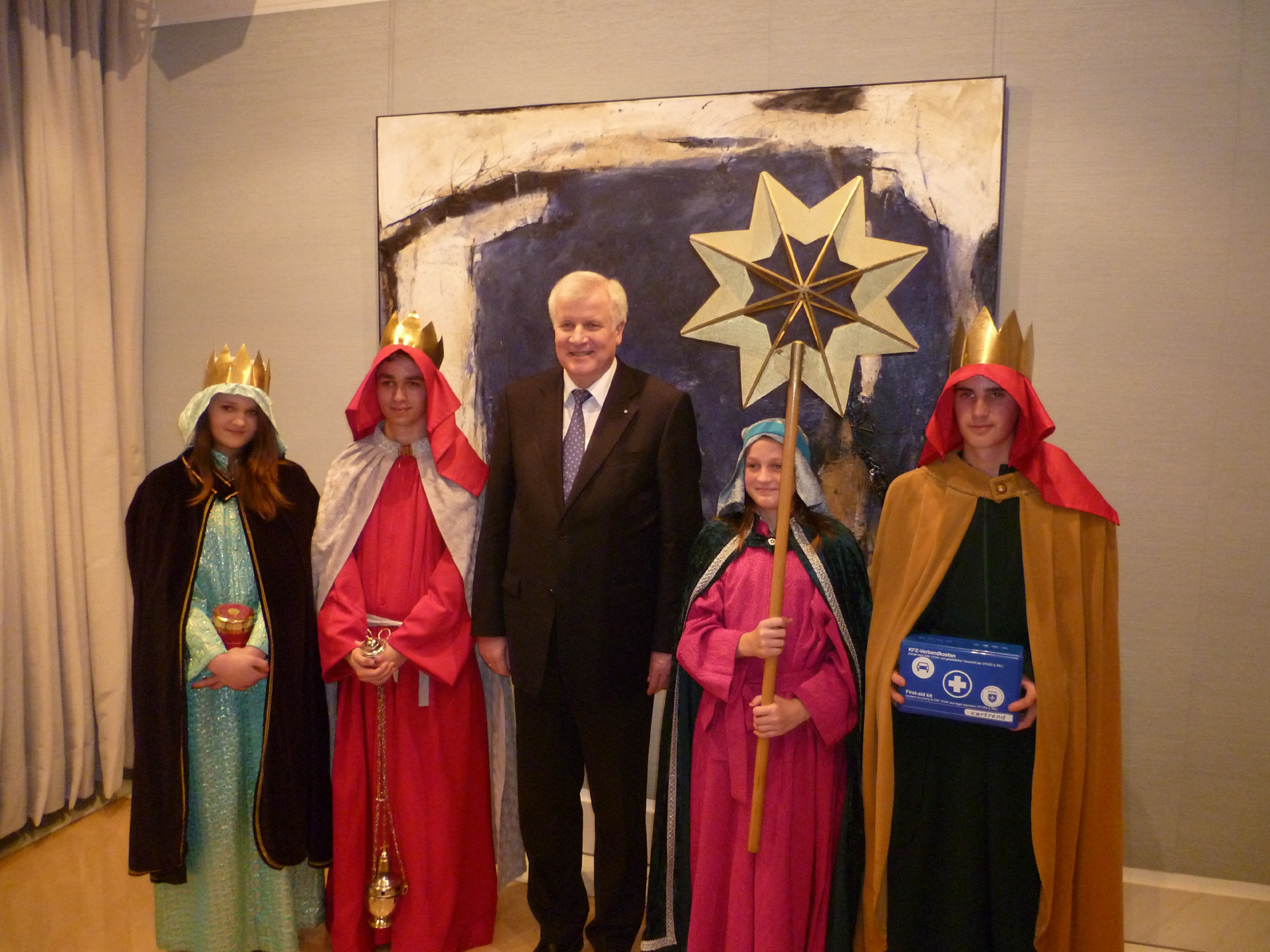 Nachdem alle Gruppen quer durch das Bistum mit dem Bus abgeholt waren, ging es nach München. Erster Halt für die reisenden Könige war das Mittagessen im Hofbräuhaus in München. Danach ging es in die Staatskanzlei um sich für den Auftritt vorzubereiten. Einkleidung, Weihrauch bereiten, Texte üben und eine gemeinsame Singprobe standen auf dem Programm. Die Spannung stieg bei den jungen Sternsinger, als es zum Empfang des Ministerpräsidenten ging. Herzlich wurden alle von Ministerpräsident Horst Seehofer begrüßt. Die Sternsinger erwiederten den Gruß und stellten ihre Aktion unter dem Motto: "Segen bringen, Segen sein - Gesunde Ernährung für Kinder auf den Philippinen und weltweit" vor. Mit verschiedenen Symbolen zeigten sie die Not von vielen Millionen mangel- und unterernährten Kindern weltweit auf. Dabei zeigten sie stellvertretend für alle Sternsinger auf, wie wichtig diese größte Aktion von Kindern für Kinder ist, wie viel mit den großzügigen Spendengeldern auf der Welt bewegt werden kann. Natürlich durfte auch das Sternsingerlied "Wir kommen daher aus dem Morgenland" nicht fehlten. Ministerpräsident Horst Seehofer dankte den jungen Christen für ihren beispielhaften Einsatz und ermunterte sie zum Engagement für Menschen in Not. Natürlich gab er auch jeder Gruppen eine Spende in die Sammeldose. Anschließend nahm er sich Zeit für ein Gruppenfoto mit jeder Pfarrgruppe.