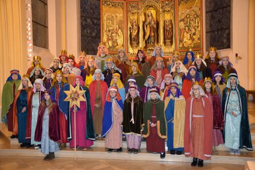 Aussendung der Sternsinger in der Pfarrei Herz Jesu Rosenberg am 1.1.2015. Im festlichen Neujahrsgottesdienst wurden am 1. Januar 2015 über 40 Ministrantinnen und Ministranten, die in orientalischen Gewändern als "Heilige Könige" den Weihnachtssegen in die Häuser zu den Menschen von Rosenberg tragen, ausgesandt. Am 02. / 03. und 05. Januar sind sie im gesamten Ortsbereich von Rosenberg unterwegs und besuchen alle Häuser. Die Sternsinger gestalteten den Gottesdienst mit Texten und Gebeten und stellten das Motto der Aktion "Segen bringen - Segen sein. Gesunde Ernährung für Kinder auf den Philippinen und weltweit!" vor. Am Beispiel des Jesuskindes in der Krippe zeigten sie auf, was für ein Kind wirklich notwendig ist, um sich gesund und gut entwickeln zu können. Damit es den Aufgaben und Herausforderungen des Lebens gewachsen ist. Sichtbar machten das die Sternsinger in den Fürbitten und der Gabenprozession, wo alles Lebensnotwendige zu den Menschen an der Kirchentüre gebracht wurde um die Verbundenheit mit den Notleidenden in der Welt zu zeigen und für sie zu beten. Die Eucharistiefeier schloss sich an. Der Spontanchor Herz Jesu unter der Leitung von Susanna Müssig-Wilczek gestaltete den Gottesdienst mit Weihnachtsliedern. Pfarrer Saju Thomas sandte am Ende die Sternsinger mit einem besonderen Segen aus und wünschte ihnen für ihren Weg durch Rosenberg viel Erfolg. An alle Bewohner von Rosenberg erging seine Bitte um freundliche Aufnahme der Sternsinger und schon im Voraus ein herzlicher Dank für die Spenden. Das Schlusslied sangen die Sternsinger für die Gemeinde.