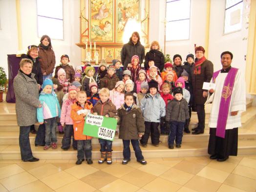 Unter diese Devise stellten die Kinder des Kneipp-Kindergarten Herz Jesu Rosenberg ihre diesjährige Faschingsfeier. Den gesamten Erlös aus Eintritt und Kuchenverkauf in Höhe von 350,- Euro überreichten die Kinder an Pfarrer Saju Thomas, der das Geld weiterleitet. Auf Anregung der Kinder entstand der Wunsch den Menschen in Haiti, die durch das schwere Erdbeben in allergrößte Not geraten sind, tatkräftig zu helfen. Zusammen mit dem Kindergartenpersonal und dem Elternbeirat wurde der Gedanke umgesetzt und spontan der Erlös aus der Faschingsfeier für diesen Zweck gespendet. Zum Beginn der Fastenzeit, am Aschermittwoch fand die Übergabe in der Herz Jesu Kirche statt. Pfarrer Saju Thomas bedankte sich bei allen Kindern und Eltern für die großzügige Spende zu Gunsten der Menschen in Haiti.