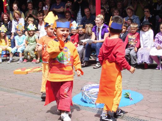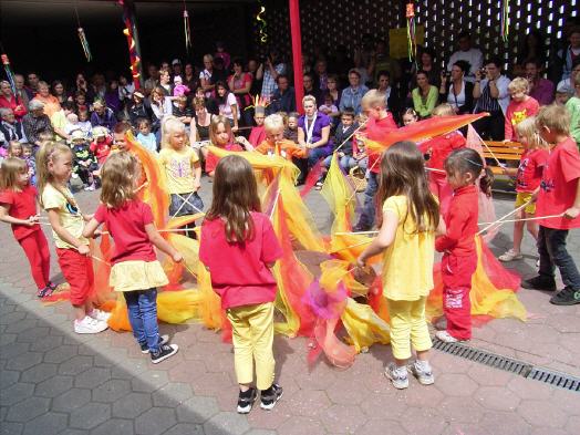 Farbenfrohes Sommerfest im Kneipp Kindergarten Herz Jesu Rosenberg. Unter dem Motto: „Feuer, Wasser, Luft, Erde – die Elemente des Lebens“ zeigten die Kinder ein buntes Programm. Den Auftakt für das Festprogramm bildete die Ansprache eines Indianerhäuptlings über die Elemente. Zum Feuer zeigten die Kinder einen Feuertanz. Für das Element Wasser stand der Wasser-Rock`n Roll und das Lied "Wasser ist zum Trinken da". Zur Luft spielten sie die Geschichte vom fliegenden Hut und sangen "Hu, hu, heult der Wind". Die Erde wurde dargeboten mit den Liedern: "Hört ihr die Regewürmer husten" und "Eine Hand voll Erde". Mit der Mahnung des Häuptlings: „Erst wenn der letzte Baum gerodet, der letzte Fluss vergiftet, der letzte Fisch gefangen ist, werdet ihr merken, dass man Geld nicht essen kann“, endete die Vorführung der Kinder.