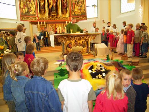 Den Auftakt bildete der Festgottesdienst in der Pfarrkirche Herz Jesu. Pfarrer Winfried Larisch freute sich über ein so volles Gotteshaus. Zum Thema Schöpfung gestalteten die Kinder ein Legebild vor dem Altar, an dem alle mirwirken konnten. Als Zeichen der Gemeinschaft mit Gott versammelten sich alle Kinder zum Vater Unser um den Altar. Musikalisch wurde der Gottesdienst von einer spontanen Band aus Kindergarteneltern und Jugendlichen gestaltet.