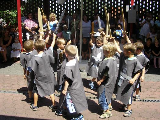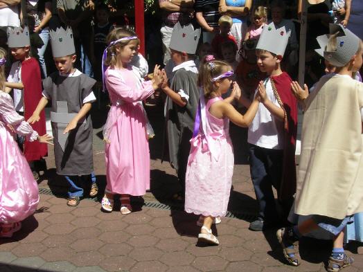en Abschluss der Vorstellung bildeten die Marketenderinnen in ihren bunten und klingenden Röcken mit einem gekonnten Tanz. Anschließend wurden die Gäste vom Elternbeirat mit Kaffee und Kuchen, sowie Gegrilltem und Käse bewirtet. Wegen der tropischen Hitze war vor allem der Getränkestand gut belagert. Für die Kinder gab es einen bunten Spieleparcours mit verschiedenen ritterlichen Aufgaben: Eine wilde Kutschenfahrt, Edelsteine ausgraben, Ringe stechen, Zielwerfen auf eine Ritterburg, Nageln und Hämmern. Beschlossen wurde das Sommerfest durch ein Kasperltheater, das vom Personal des Kindergartens gezeigt wurde. Viel Lob und Anerkennung von den Besuchern gab es für den kurzweiligen Nachmittag. Die Kindergartenleiterin Gabi Wachter bedankte sich, auch im Namen der Kinder bei allen Helfern, die es möglich machten dieses Fest für die Kinder durchzuführen.