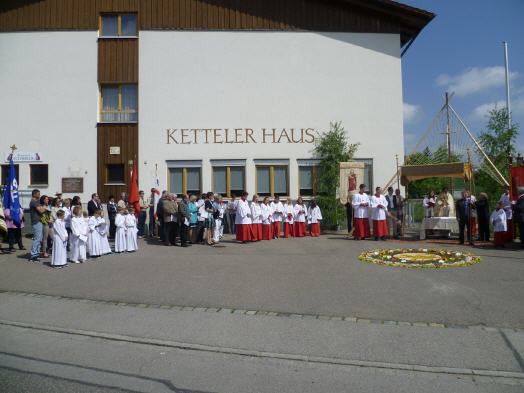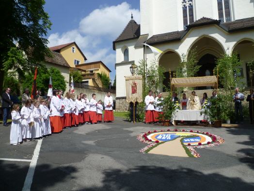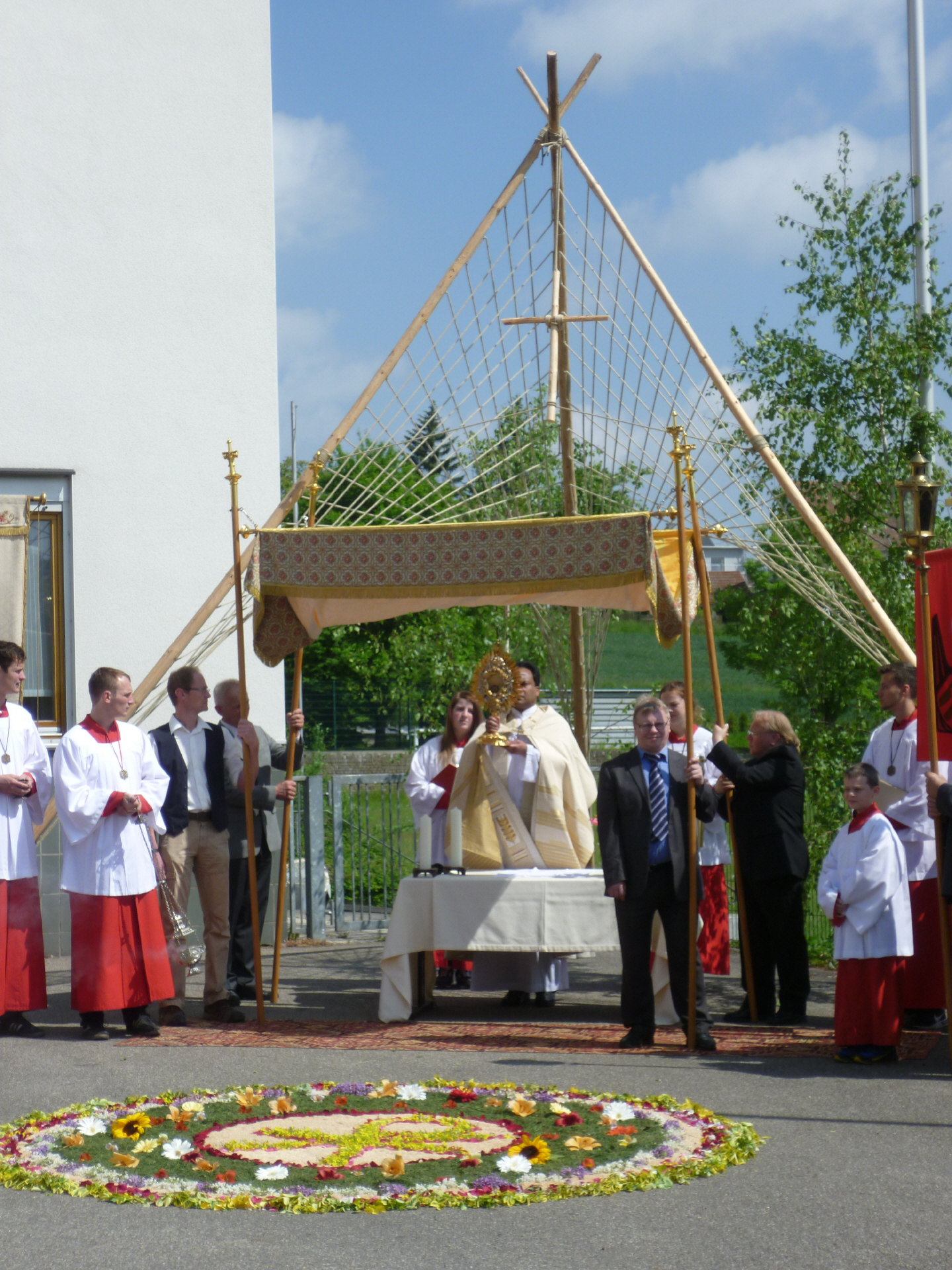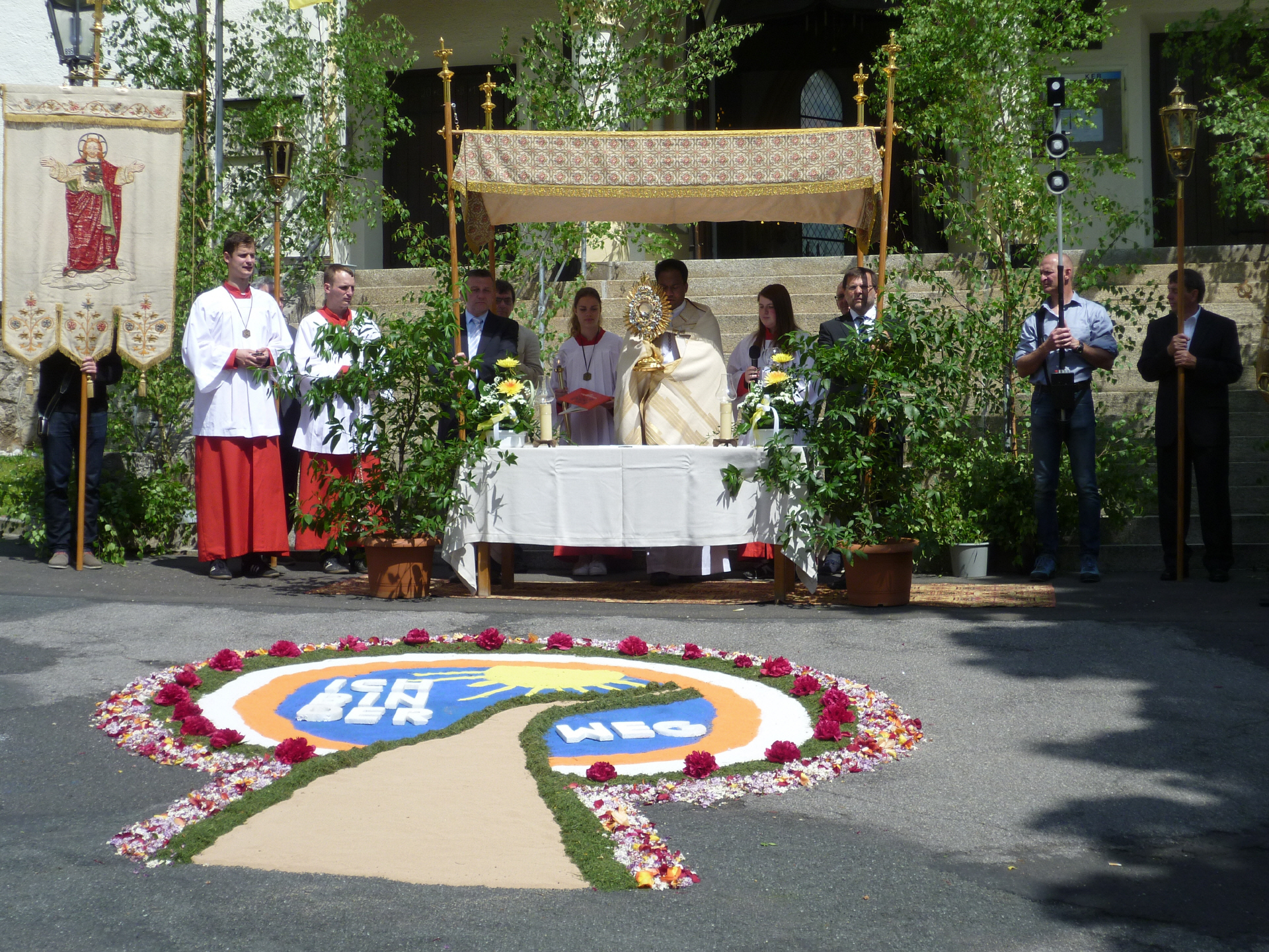 Das Allerheiligste, Jesus Christus im Heiligen Brot, in der Monstranz von Pfarrer Saju Thomas getragen, wurde begleitet von den Erstkommunionkindern und den Ministranten. Mit Musik von den Bläsern und Kirchenchor und Wechselgebeten ging es am Feuerwehrhaus vorbei über die Jahnstraße zum Kettelerhaus. Den ersten Altar hattn die Pfadfinder aus Holz kunstvoll gebaut. Den Blumenteppich mit dem Motiv der Heiligen Kommunion hatten die Ministranten gestaltet.