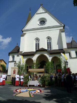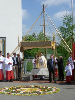 Nach dem Evangelium und den Fürbitten segnete Pfarrer Saju die Gemeinde mit dem Allerheiligsten und die Prozession zog weiter über die wunderschön geschmückte Meierfeld- und Konrad Kurz Straße zur Herz Jesu Kirche. Vor dem Eingangsportal war der zweite Altar errichtet worden. Den Blumenteppich gestaltete der Frauenbund mit dem Ich-Bin Wort von Jesus: Ich bin der Weg. Nach dem festlichen Schlusssegen dankte Pfarrer Saju allen, die zum Gelingen des Festes beigetragen haben, die Teppiche gelegt und die Altäre gestaltet hatten, dem Pfarrgemeinderat und der Kirchenverwaltung für die Organisation, der Musik unter der Leitung von Johannes Doleschal. Auch der Freiwilligen Feuerwehr Rosenberg galt sein Dank für die Absicherung des Weges und allen Anwohnern, die ihre Anwesen wunderbar geschmückt hatten.