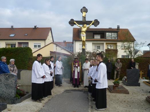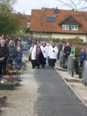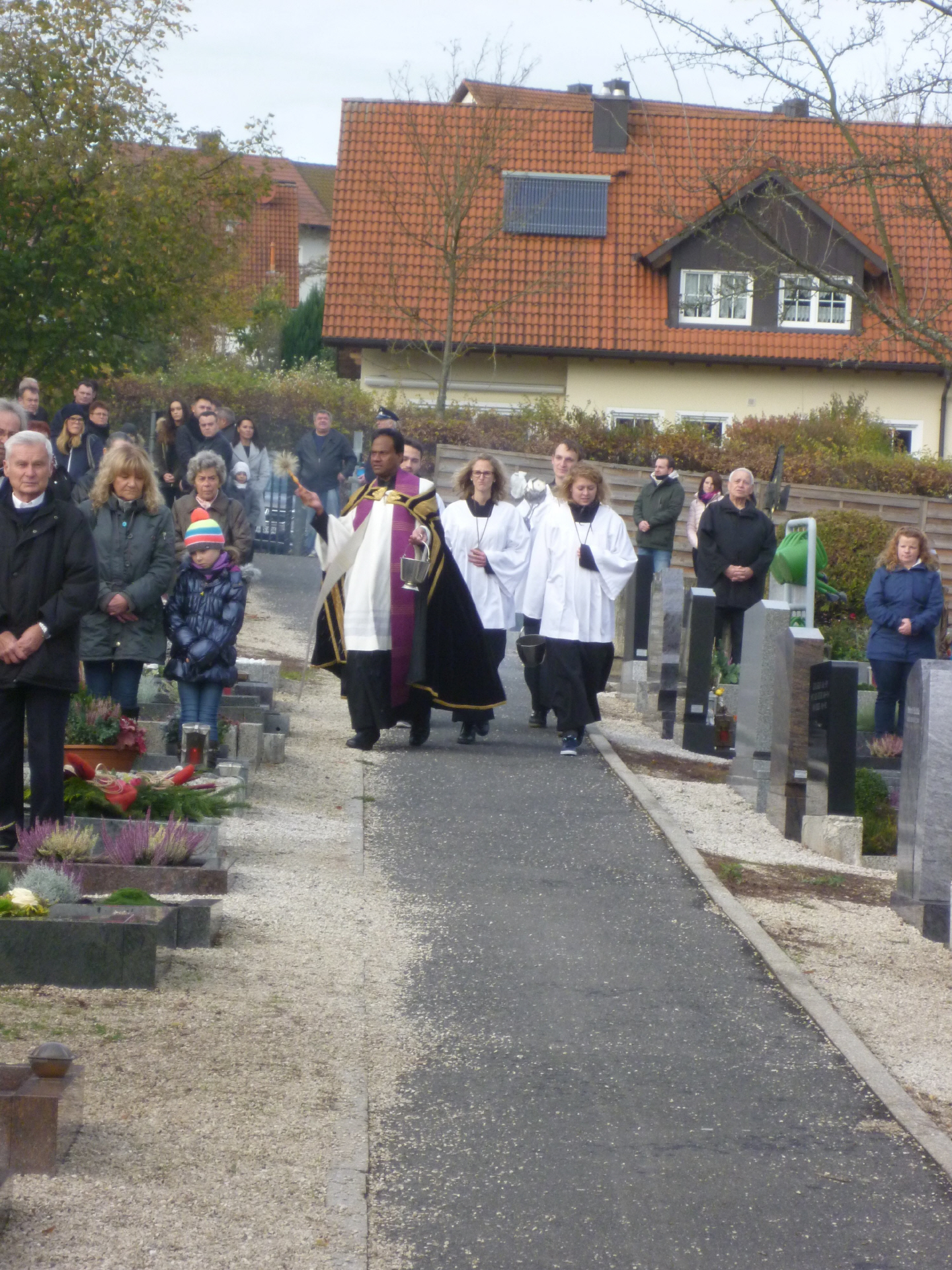 In der Kirche feierte die Herz Jesu Pfarrei in Rosenberg am Nachmittag des Allerheiligenfestes das Gedenken an die Verstorbenen. In seiner Predigt rief Pfarrer Saju dazu auf, sich immer wieder an die schönen nicht wieder kehrenden Momente mit den Verstorbenen zu erinnern und in den Herzen zu bewahren und sie in Gott geborgen zu Wissen. Die Hoffnung auf ein Wiedersehen in Gottes Herrlichkeit ist es, die alle Angehörigen jedes Jahr an Allerheiligen auf dem Friedhof zusammen führt. Namentlich wurden alle Verstorbenen des letzten Jahres gedacht. Anschließend zog die Gemeinde zum Friedhof, wo die Gräber mit Weihrauch und Weihwasser gesegnet wurden.