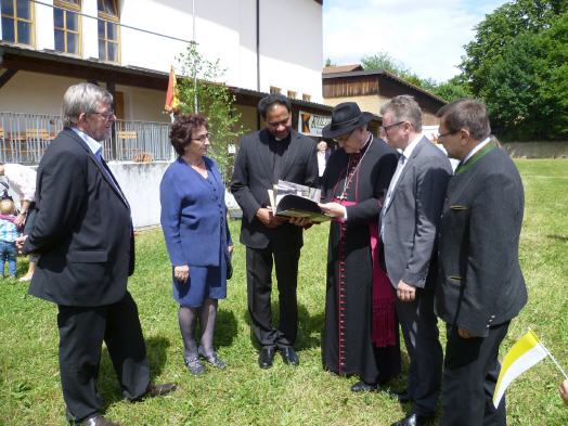 Eine besondere Ehre war es für die Kinder des Kneipp-Kindergarten bei ihrer Darbietung den Bischof als Gast zu haben. So zeigten die Kinder in ihren Liedern das Leben am Teich mit Fischen, Libellen, den Wassermännern und einem Frosch. Der Bischof dankte dem Kindergartenpersonal für die Mühe und Sorge um die Kinder und beglückwünschte die Kinder zu ihrer gelungenen Darstellung von Gottes wunderbarer Schöpfung. Mit großem Applaus verabschiedeten alle Gäste den Bischof.
