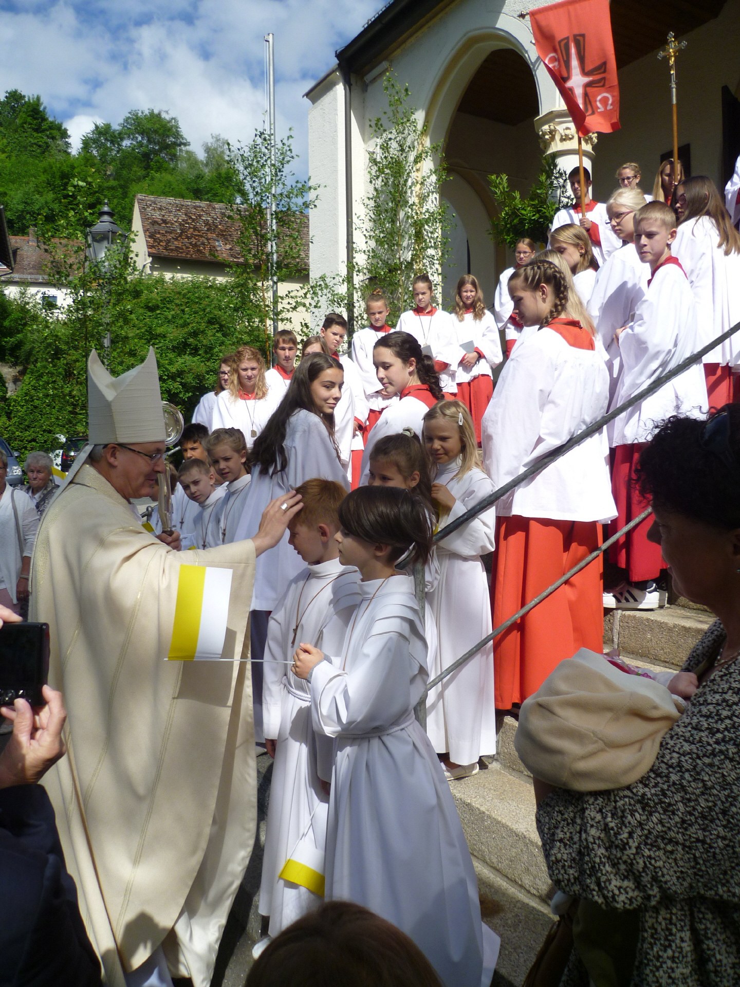 Beim Empfang am Kirchenportal durch die Ministranten und Erstkommunionkinder segnet der Bischof die Kinder.