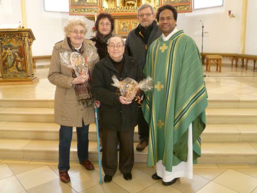 In seiner Laudatio dankte er Frau Cäcilia Thieme für die langjährige Übernahme vieler verschiedener Dienste rund um die Kirche. Fast 50 Jahre hat sie sich vom Aufsperren der Kirche bis zur Pflege der Mariengrotte stets um die Pfarrkirche gesorgt. Pfarrer Saju überreichte ihr zusammen mit Kirchenpflegerin Brigitte Heller und Pfarrgemeinderatssprecher Wolfgang Albersdörfer als Geschenk der Pfarrei eine Marienfigur. Lothar Meier hatte 45 Jahre lang den Dienst als Kommunionhelfer vorbildlich versehen und erhielt zur Verabschiedung eine Herz-Jesu-Figur.