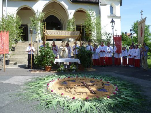 Den ersten Altar haben die Pfadfinder aus Holz kunstvoll aufgebaut. Der Blumenteppich mit den Motiven der Eucharistie, Brot und Wein hatte der katholische Frauenbund gelegt. Nach dem Evangelium und den Fürbitten wurde der Ort und die Gemeinde mit dem Allerheiligsten gesegnet. Der Weg führte weiter durch die geschmückten Straßen im Meierfeld zum zweiten Altar vor dem Portal der Herz Jesu Kirche. Den Blumenteppich mit einem ausgeschmückten Kreuz zur Ehre Gottes legten die Ministranten. Nach dem Schlusssegen dankte Pfarrer Saju allen, die zum Gelinges des Fronleichnamsfestes beigetragen haben, die die Teppiche gelegt und die Altäre gestaltet haben, dem Pfarrgemeinderat und der Kirchenverwaltung für die Organisation, den Bläsern und dem Kirchenchor unter der Leitung von Johannes Doleschal. Auch der Freiwilligen Feuerwehr Rosenberg galt sein Dank für die Absicherung des Weges und allen Anwohnern, die ihre Anwesen wunderbar geschmückt haben.