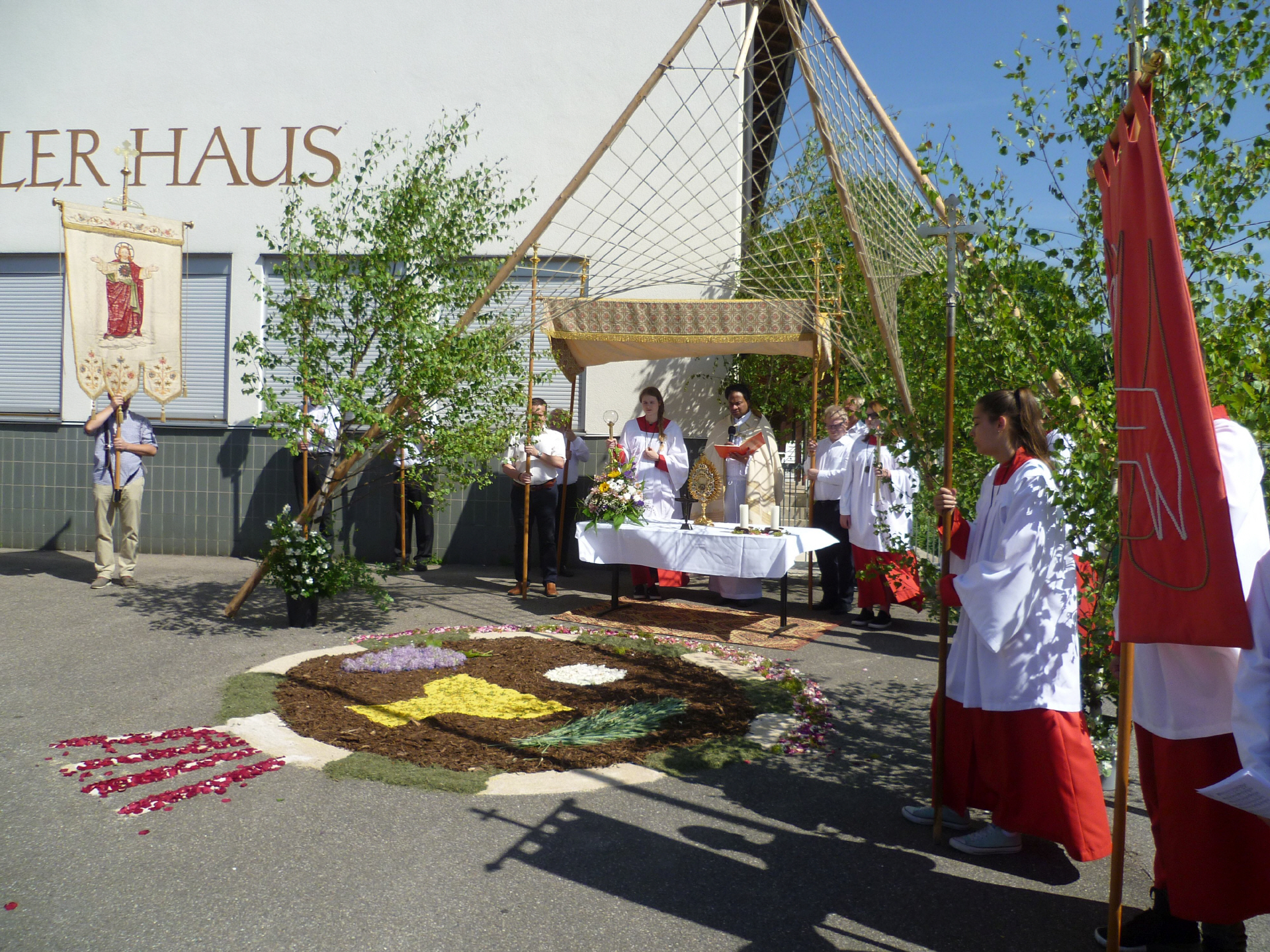 Der erste Altar am Kettelerhaus. Den Baldachin haben die Pfadfinder gebaut. Den Blumenteppich der Katholische Frauenbund gelegt.