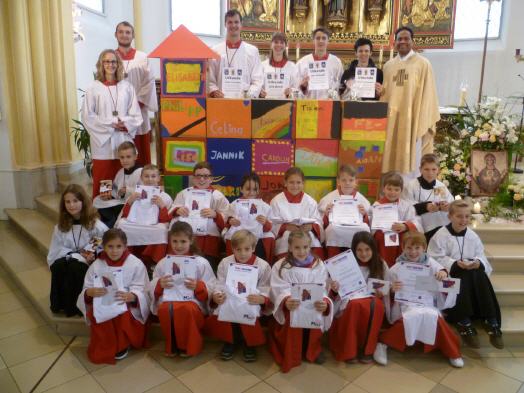 Dazu bauten sie eine mit ihren Namen bemalte Kirche auf und deuteten das Motto in einem Sprechspiel. 12 Mädchen und Buben konnte Pfarrer Saju neu in die Ministrantengemeinschaft aufnehmen und vier Kindern für ihren treuen Dienst die Plakette überreichen. Musikalisch wurde die Feier von der Ministrantenband unter der Leitung von Sebastian Brandl gestaltet.