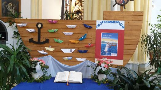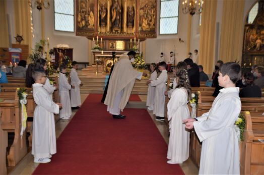 Die Schülerinnen und Schüler gestalteten den Gottesdienst, welchen Pfarrer Saju Thomas zelebrierte, aktiv mit. Das diesjährige Erstkommunionthema lautete "Vertrau mir, ich bin da!". Dieser Satz, den Jesus zu Petrus sprach, als dieser unterzugehen drohte, gilt gleichermaßen für uns als Glaubende, besonders in der Pandemie: "Vertrau mir, ich bin da!". In seiner Predigt ging Pfarrer Thomas näher auf das Thema ein: „Das Gottvertrauen ist wichtiger dann je in dieser pandemiebedingten Zeit geworden. Wenn das menschliche Tun ihre Grenze erreicht hat, steht Gott da für uns. Mit Gottes Hilfe sind wir sicherer unterwegs als allein zu kämpfen. Ohne Gottvertrauen mangelt es auch am Selbstvertrauen.